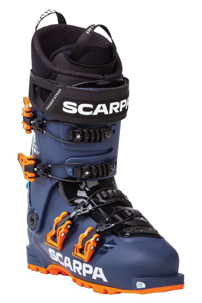 The GT adds higher volume—including an extra 1 millimeter of last—a warmer Intuition liner than its line mates and a multilayer footbed to the boot’s tried-and-true formula. The resulting comfort led a Crested Butte local to proclaim, “I’d walk all day in these!” The GT also sports a softer, more forgiving flex than Scarpa’s previous EC-winning XT and Pro models due to a fully polyurethane cuff and shell. The closure mechanism remains unchanged, with four buckles and a power strap locking down an Alpine Axial Hybrid cuff—essentially an overlap tongue that cinches down when tightened to increase power transfer. When locked down, the boot offers 17 degrees of forward lean with 2 degrees of adjustability. “Maintains a lot of the touring performance of the other Quattros but softer and easier to ski,” explained a Vermonter who’s skied every version of the boot. He added the lack of carbon reinforcement made the boot “seem damper as well.”