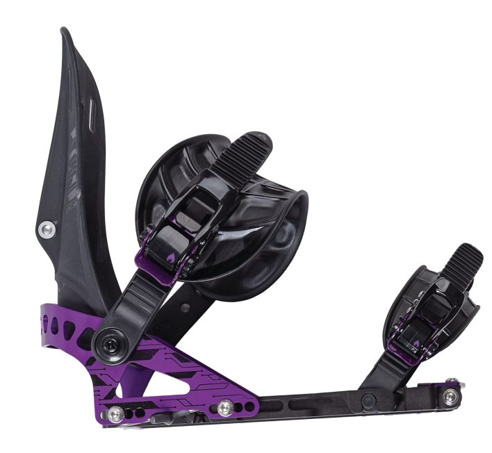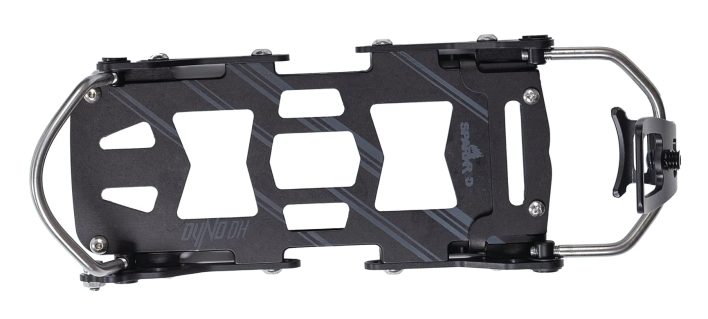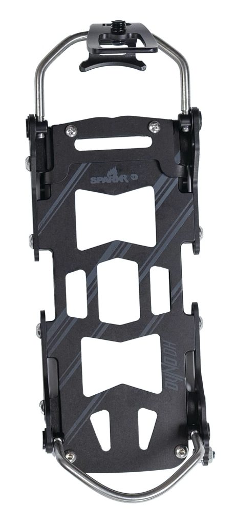 The Dyno DH fits Spark’s ubiquitous pucks. “I have an oversized quiver and primarily ride Spark softboot bindings, with one board set up for hardboot missions,” explained a Tahoe board hoarder. “Having the ability to ride hardboots on [any of my] splits mounted with Spark pucks opens up my quiver tremendously.” The Dyno DH was impressive on the descent, too. After a “time-consuming” customization process, per a Teton tester, stainless steel bails provide efficient power transfer. “It’s like you’re suction-cupped to the board. The most solid-feeling hardboot binding out there,” commented another hardbooter, although he voiced concern that ice or wayward branches could release the easy-to-disengage toe levers. A CNC’d skeletal baseplate saves weight and adds lateral flex. Paired with Spark’s canted pucks, the ride is smooth. “I felt comfortable on steep terrain with a thin layer of leftover pow over chunder,” commented the board hoarder, although he noted concerns regarding tech toe durability.