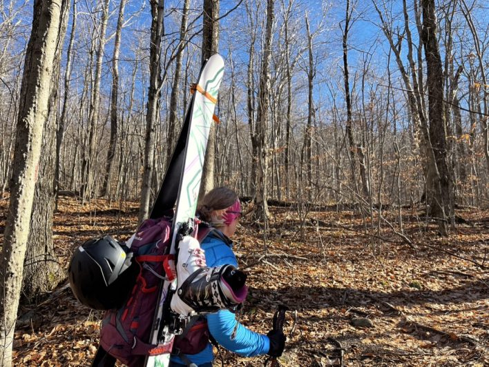 The same concept applies to clothing. Because you spend most of your time moving uphill, you generally don’t need to dress as warmly as you typically do for a day at the ski hill. Though it’s always good to bring a puffy in your pack just in case you get cold at some point.